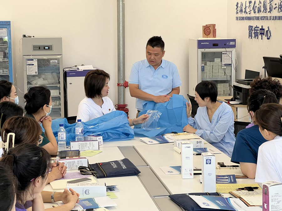威廉希尔作为该院长期稳定的医用耗材供应商,优质的产品和服务一直以来备受青睐,为了使学员在培训中更加深入了解医用耗材的使用方法、护理流程,为学员搭建更面对面的交流平台,全面提升血液净化专科护理质量,9月14日, 威廉希尔吉林分公司与吉大二院肾内科开展学习产品分享交流活动,共同探讨如何加强产品创新力度,进一步提升医护工作效率和质量,减轻医护工作量,让临床护理健康服务更加便捷智慧。来自吉林、黑龙江、辽宁、山东、湖北、江西等各地重点医院血液净化专科的近30名护理老师参加此次交流活动。