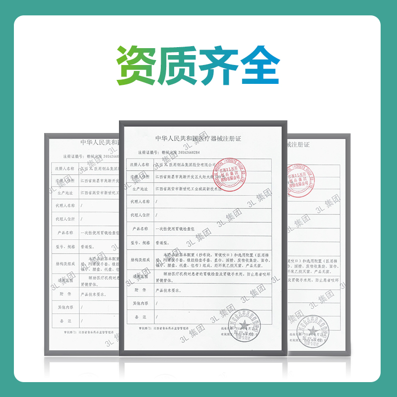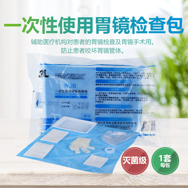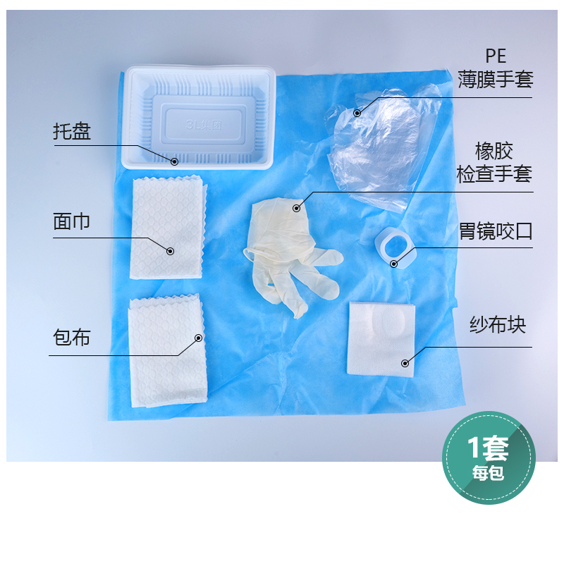 一次性使用胃镜检查包:由纱布块、胃镜咬口、围脖、面巾等主要组件,可根据需要选配组件。用于辅助医疗机构对患者的胃镜检查及胃镜手术用,防止患者咬坏胃镜管体。